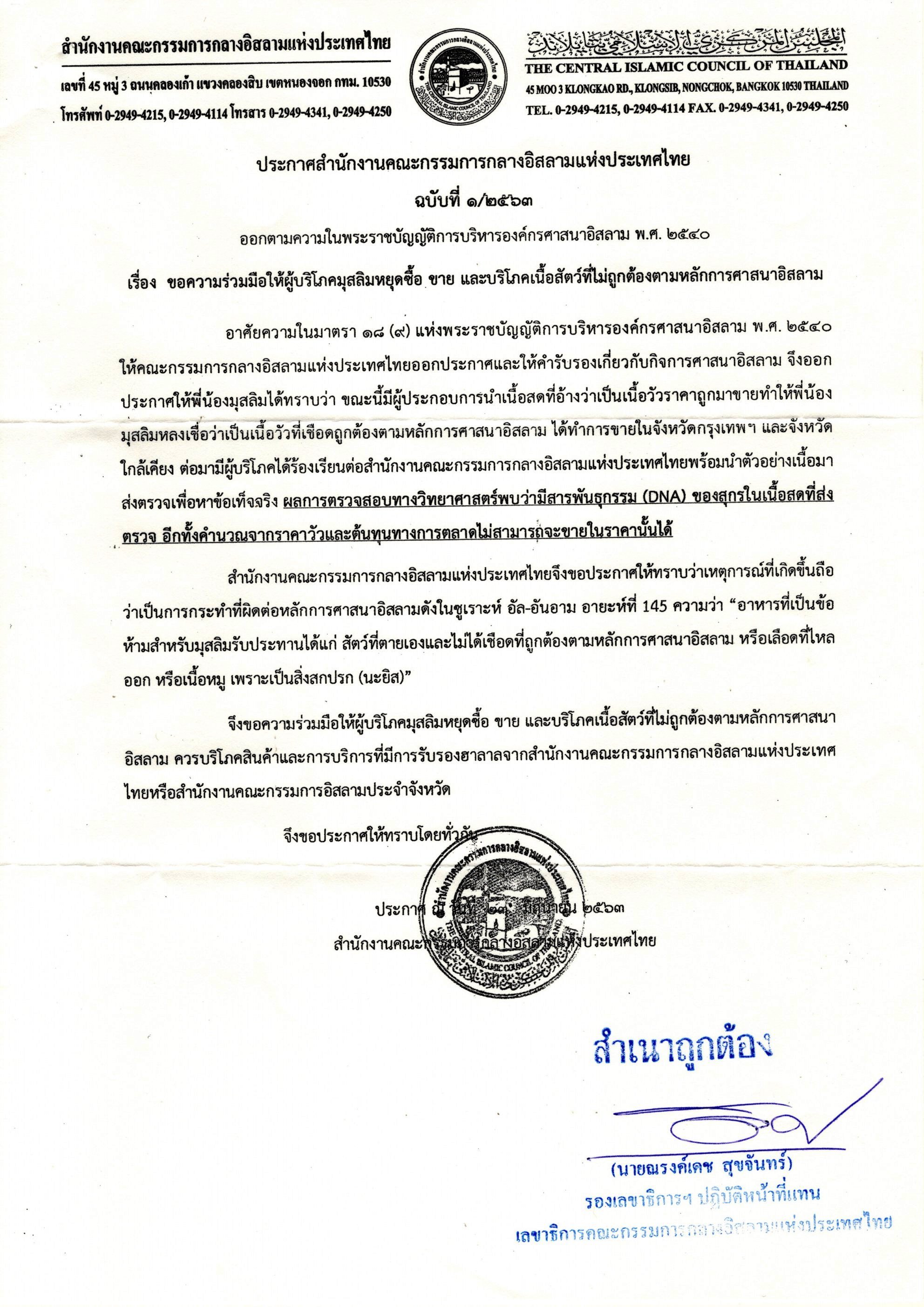 ขอความร่วมมือให้ผู้บริโภคมุสลิมหยุดซื้อขาย และบริโภคเนื้อสัตว์ที่ไม่ถูกต้องตามหลักการศาสนาอิสลาม